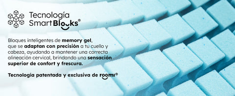 La almohada SmartBlocks de roomi combina inteligencia y confort en una sola pieza. Su estructura de bloques inteligentes de memory gel adaptables responde al movimiento de tu cabeza y cuello, distribuyendo el peso de forma precisa para aliviar la presión y mantener una alineación cervical natural.