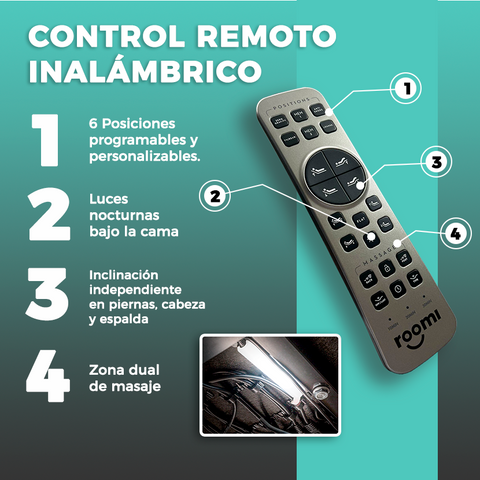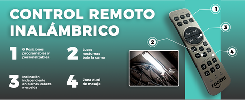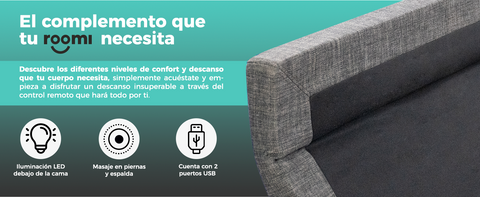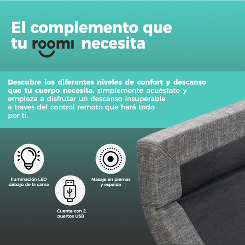 Descubre la base ajustable Roomi, diseñada para transformar tu cama en un espacio de máximo confort. Controla todo con un solo clic desde el control remoto y disfruta de múltiples posiciones adaptadas a lo que tu cuerpo necesita.